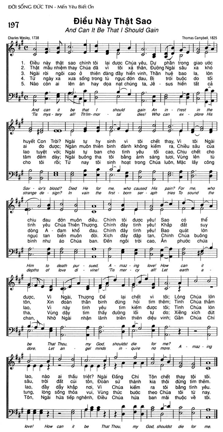 1. Điều này thật sao chính tôi lại được Chúa yêu, Dự phần trong giao ước huyết Con Trời? Ngài tự hy sinh vì tôi chết thay, Vì tôi Ngài chịu đau đớn muôn điều. Chính tôi được yêu! Sao có thể được, Vì Ngài, Thượng Đế lại chết vì tôi; Lòng Chúa lớn lao, nào ai thấu triệt? Ngài Đấng Chí Tôn chết thay tôi tôi. 2. Thật mầu nhiệm thay Chúa đã vì tôi xả thân, Đường Ngài sâu xa khó ai đo được; Ngàn muôn thiên binh đành không kiếm ra, Chiều sâu của tình yêu Chúa Thiên Thượng. Chính đây tình yêu! Khắp đất tôn, Xin đoàn thần binh đừng hỏi tìm thêm: Tình Chúa thẳm sâu, trời đất cúi tôn, Đoàn sứ thánh kia thôi đừng tìm thêm. 3. Ngài rời ngôi cao ở thiên đàng đầy hiển vinh, Thần huệ bao la, lớn lao tuyệt vời; Ngài tự ban cho tình yêu tối cao, Chịu chết cho tình yêu! Bao quát lớn lao, Vì này tình yêu tìm kiếm được tôi; Tình Chúa lớn lao, đầy dầy khắp nơi, Vì Chúa kiếm ra tôi bằng tình yêu. 4. Từ ngày xa xưa sống trong tù ngục đớn đau, Bị trói buộc do tôi tăm đêm dày; Ngài buông tha tôi bằng ánh sáng tươi, Vùng lên tù ngục tan biến muôn đời. Xích đây đập tan, Chính Chúa buông tha, Vùng dậy tìm thấy đường lối tự do; Xiềng xích dứt tung. lòng sống thỏa vui, Vùng thức bước theo Chúa tôi từ nay. 5. Nào còn ai lên án hay dọa nạt chúng ta, Jê-sus hiến tất cả cho tôi rồi; Từ nay tôi sinh hoạt trong Chúa luôn, Mặc lấy công bình như áo Chúa ban. Đến ngôi trời cao, Ân phước chứa chan, Nhờ Ngài nhận lãnh triền thiên diệu vinh; Gần Chúa Chí Tôn, Ngài hứa tiếp nghênh, Điều Chúa hứa ban mãi thuộc về tôi.