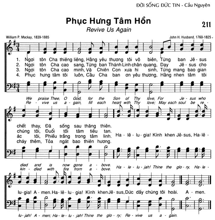 1. Ngợi tôn Cha thiêng liêng, Hằng yêu thương tôi vô biên, Từng ban Jê-sus chết thay, Đã sống sau thăng thiên. 2. Ngợi tôn Cha cao sang, Từng ban Thánh Linh chân quang, Dạy Jê-sus cho chúng tôi, Đuổi tối tăm tiêu tan. 3. Ngợi tôn Cha cao minh, Về Chiên Con xưa hi sinh, Từng mang bao gian ác tôi, Phiếu trắng trong tâm linh. 4. Phục hưng tâm tôi luôn, Cầu Cha ban ơn yêu thương, Hằng nhen tâm tôi cháy thêm, Tỏa ngát bao thiên hương. Điệp khúc: Ha-lê-lu-gia! Kính khen Jê-sus, Ha-lê-lu-gia! A-men. Ha-lê-lu-gia! Kính khen Jê-sus, Đức dấy chúng tôi hoài. A-men.