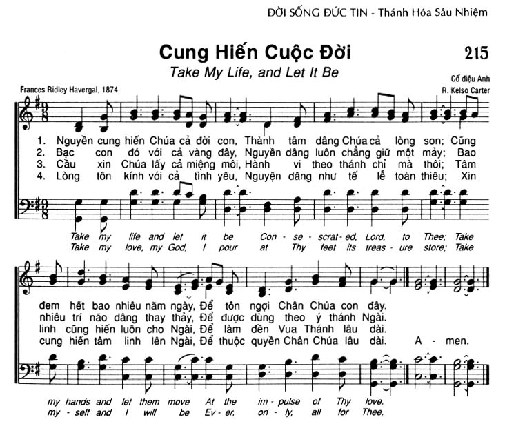 1. Nguyền cung hiến Chúa cả đời con, Thành tâm dâng Chúa cả lòng son; Cũng đem hết bao nhiêu năm ngày, Để tôn ngợi Chân Chúa con đây. 2. Bạc con đó với cả vàng đây, Nguyền dâng luôn chẳng giữ một mảy; Bao nhiêu trí não dâng thay thảy, Để được dùng theo ý thánh Ngài. 3. Cầu xin Chúa lấy cả miệng môi, Hành vi theo thánh chỉ mà thôi; Tâm linh cũng hiến luôn cho Ngài, Để làm đền Vua Thánh lâu dài. 4. Lòng tôn kính với cả tình yêu, Nguyện dâng như tế lễ toàn thiêu; Xin cung hiến tâm linh lên Ngài, Để thuộc quyền Chân Chúa lâu dài. A - men.