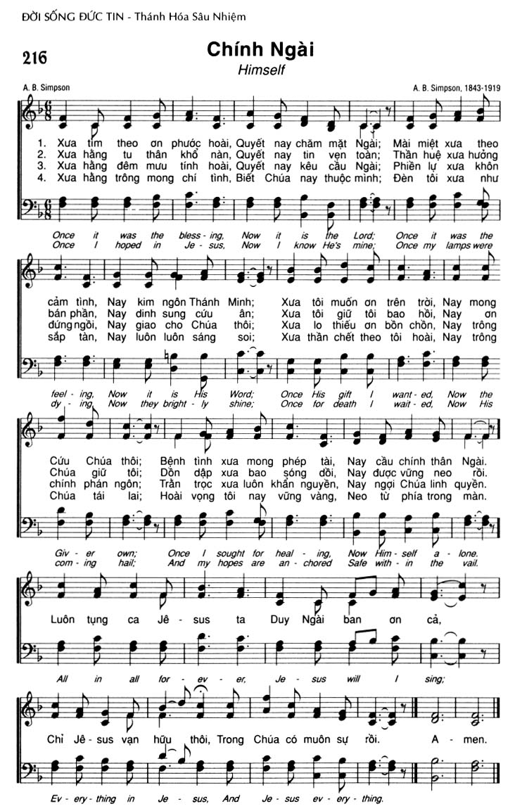 1. Xưa tìm theo ơn phước hoài, Quyết nay chăm mặt Ngài; Mài miệt xưa theo cảm tình, Nay kim ngôn Thánh Minh; Xưa tôi muốn ơn trên trời, Nay mong Cứu Chúa thôi; Bệnh tình xưa mong phép tài, Nay cầu chính thân Ngài. 2. Xưa hằng tu thân khổ nàn, Quyết nay tin vẹn toàn; Thần huệ xưa hưởng bán phần, Nay dinh sung cứu ân; Xưa tôi giữ tôi bao hồi, Nay ơn Chúa giữ tôi; Dồn dập xưa bao sóng đồi, Nay được vững neo rồi. 3. Xưa hằng đêm mưu tính hoài, Quyết nay kêu cầu Ngài; Phiền lự xưa khôn đứng ngồi, Nay giao cho Chúa thôi; Xưa lo thiếu ơn bồn chồn, Nay trông chính phán ngôn; Trằn trọc xưa luôn khẩn nguyện, Nay ngợi Chúa linh quyền. 4. Xưa hằng trông mong chí tình, Biết Chúa nay thuộc mình; Đèn tôi xưa như sắp tàn, Nay luôn luôn sáng soi; Xưa thần chết theo tôi hoài, Nay trông Chúa tái lai; Hoài vọng tôi nay vững vàng, Neo từ phía trong màn. Điệp khúc: Luôn tụng ca Jêsus ta Duy Ngài ban ơn cả, Chỉ Jêsus vạn hữu thôi, Trong Chúa có muôn sự rồi. Amen.
