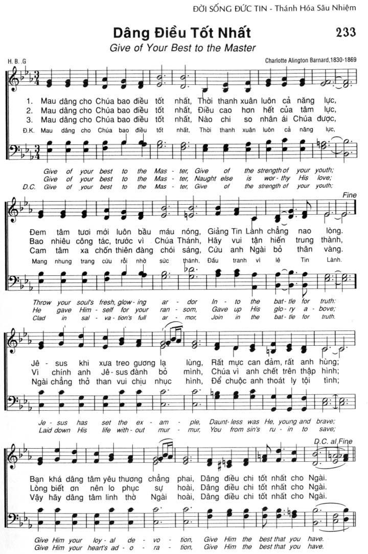 1. Mau dâng cho Chúa bao điều tốt nhất, Thời thanh xuân luôn cả năng lực, Đem tâm tươi mới luôn bầu máu nóng, Giảng Tin Lành chẳng nao lòng. Jêsus khi xưa treo gương lạ lùng, Rất mực can đảm, rất anh hùng; Bạn khá dâng tâm yêu thương chẳng phai, Dâng điều chỉ tốt nhất cho Ngài. 2. Mau dâng cho Chúa bao điều tốt nhất, Điều cao hơn hết của tâm lực, Bao nhiêu công tác, trước vì Chúa Thánh, Hãy vui tận hiến trung thành, Vì chính anh Jêsus đành bỏ mình, Chúa vì anh chết trên thập hình; Lòng biết ơn nên lo phục sự hoài, Dâng điều chỉ tốt nhất cho Ngài. 3. Mau dâng cho Chúa bao điều tốt nhất, Nào chi so nhân ái Chúa được, Cam tâm xa chốn thiên đàng chói sáng, Cứu anh Ngài bỏ thân vàng. Ngài chẳng thở than vui chịu nhục hình, Để chuộc anh thoát ly tội tình; Vậy hãy dâng tâm linh thờ Ngài hoài, Dâng điều chỉ tốt nhất cho Ngài. Điệp khúc: Mau dâng cho Chúa bao điều tốt nhất, Thời thanh xuân luôn cả năng lực, Mang nhung trang cứu rồi nhờ sức thánh, Đấu tranh vì lẽ Tin Lành.
