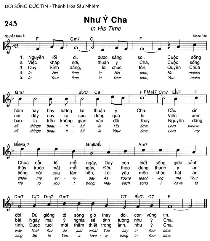 1. Nguyện lối đi, được sáng soi, Cuộc sống hôm nay hay tương lai thuận ý Cha. Chúa dẫn lối mỗi ngày, Dạy con biết sống giữa cảnh đời, Dù giông tố sóng gió thay dời, con vững tin. 2. Việc khắp nơi, thuận ý Cha, Cuộc sống nơi đây nay ra sao đừng quá lo. Thấy trước mắt mỗi ngày, Đều theo đúng thánh ý an bài, Ngày mai ý nghĩa sẽ tinh tường, như ý Cha. 3. Quỳ kính dâng, lời chúc tôn, Quyền Chúa bao la trên không gian nào đổi thay. Tiếng nói của tâm hồn, Lời yêu mến khúc hát ân tình, Được tươi mới thắm thiết trong lành, như ý Cha. 4. In His time, in His time, He makes all things beau-ti-ful in His time. Lord, please show me ev-'ry day, As You're teach-ing me Your way, That You do just what You say in Your time. 5. In Your time, in Your time, You make all things beau-ti-ful in Your time. Lord, my life to You I bring, May each song I have to sing Be to You a love-ly thing in Your time.