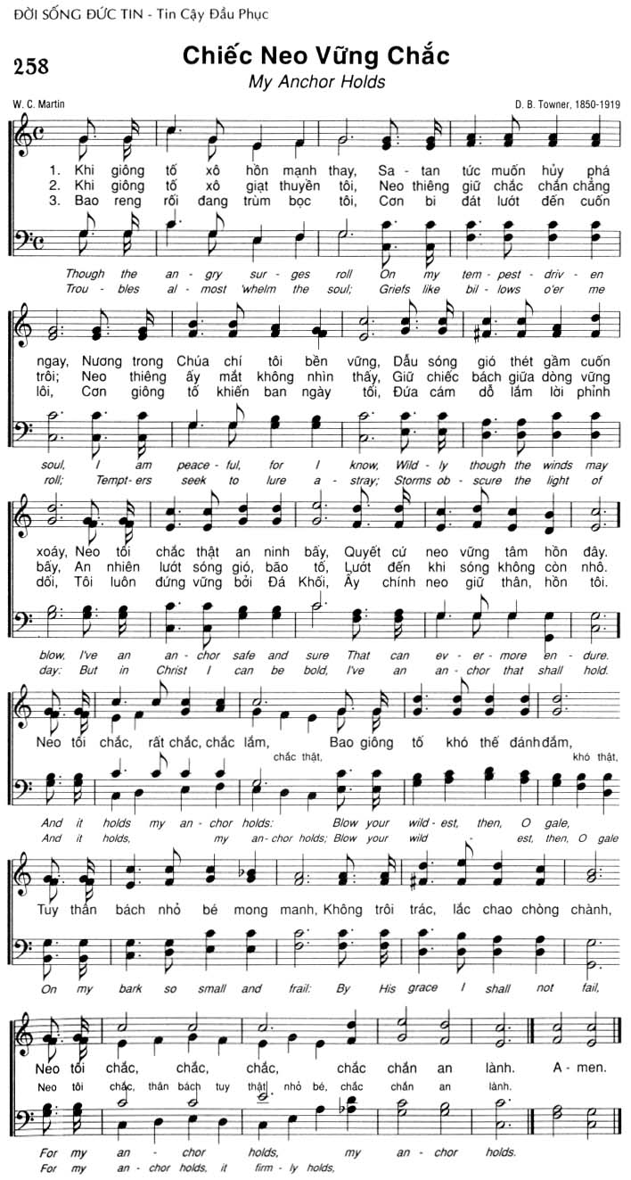 1. Khi giông tố xô hồn mạnh thay, Sa-tan tức muốn hủy phá ngay, Nương trong Chúa chí tôi bền vững, Dầu sóng gió thét gầm cuốn xoáy, Neo tôi chắc thật an ninh bẩy, Quyết cử neo vững tâm hồn đây. Tuy thân bách nhỏ bé mong manh, Không trôi trác, lắc chao chòng chành, 2. Khi giông tố xô giạt thuyền tôi, Neo thiêng giữ chắc chắn chẳng trôi; Neo thiêng ấy mắt không nhìn thấy, Giữ chiếc bách giữa dòng vững bẩy, An nhiên lướt sóng gió, bão tổ, Lướt đến khi sóng không còn nhô. Tuy thân bách nhỏ bé mong manh, Không trôi trác, lắc chao chòng chành, 3. Bao reng rồi đang trùm bọc tôi, Cơn bi đát lướt đến cuốn lôi, Cơn giông tố khiến ban ngày tối, Đứa cám dỗ lắm lời phỉnh dối, Tôi luôn đứng vững bởi Đá Khối, Ấy chính neo giữ thân, hồn tôi. Tuy thân bách nhỏ bé mong manh, Không trôi trác, lắc chao chòng chành, Điệp khúc: Neo tôi chắc, rất chắc, chắc lắm, Bao giông tố khó thể đánh đắm, chắc thật, khó thật, Neo tôi chắc, chắc, chắc, chắc chắn an lành. Neo tôi chắc, thân bách tuy thật nhỏ bé, chắc chắn an lành.