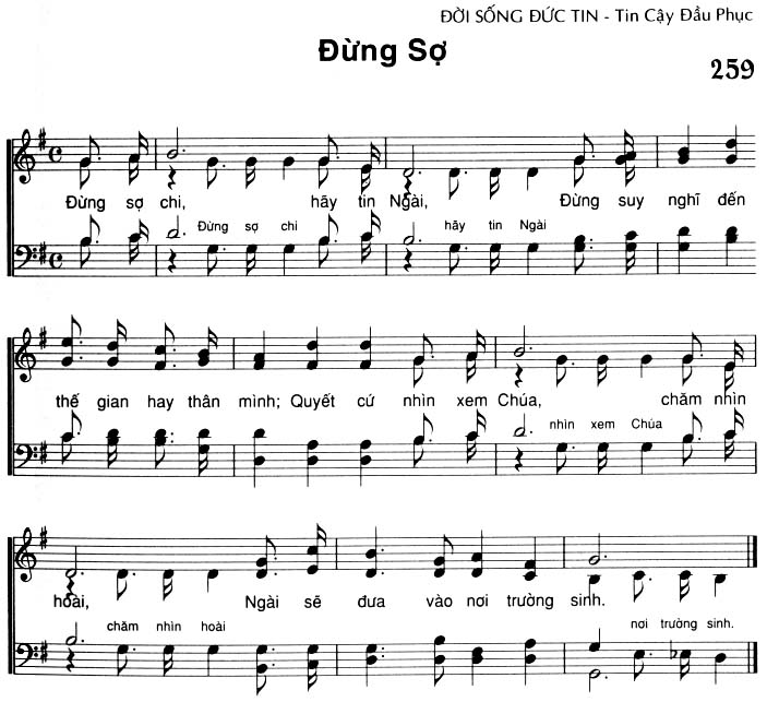 1. Đừng sợ chi, hãy tin Ngài, Đừng suy nghĩ đến thế gian hay thân mình; Quyết cứ nhìn xem Chúa, chăm nhìn hoài, Ngài sẽ đưa vào nơi trường sinh.