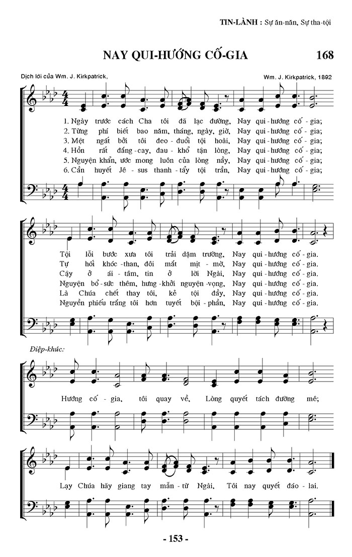 1. Ngày trước cách Cha tôi đã lạc đường, Nay qui - hướng cố - gia; Tôi lỗi bước xưa tôi trải dặm trường, Nay qui - hướng cố - gia. 2. Từng phí biết bao năm, tháng, ngày, giờ, Nay qui - hướng cố - gia; Tự hối khóc than, đôi mắt mịt mờ, Nay qui - hướng cố - gia. 3. Mệt ngất bởi tôi đeo đuổi tội hoài, Nay qui - hướng cố - gia; Cậy ở ái tâm, tin ở lời Ngài, Nay qui - hướng cố - gia. 4. Hồn rất đắng cay, đau khổ tận lòng. Nay qui - hướng cố - gia; Nguyện bổ sức thêm, hưng - khởi nguyện vọng, Nay qui - hướng cố - gia. 5. Nguyện khẩn, ước mong luôn của lòng nầy, Nay qui - hướng cố - gia; Là Chúa chết thay tôi, kẻ tội đầy, Nay qui - hướng cố - gia. 6. Cần huyết Jê sus thanh tẩy tội trần, Nay qui - hướng cố - gia; Nguyện phiếu trắng tôi hơn tuyết bội phần, Nay qui - hướng cố - gia. Điệp khúc: Hương cố gia, tôi quay về, Lòng quyết tách đường mê; Lạy Chúa hãy giang tay mẫn - từ Ngài, Tôi nay quyết đáo - lai.