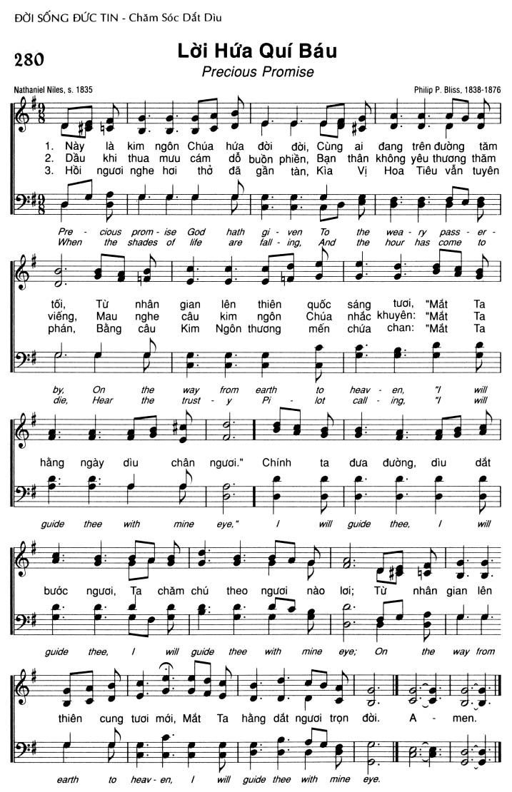 1. Này là kim ngôn Chúa hứa đời đời, Cùng ai đang trên đường tăm tối, Từ nhân gian lên thiên quốc sáng tươi, "Mắt Ta hằng ngày dìu chân ngươi." Chính ta đưa đường, dìu dắt bước ngươi, Ta chăm chú theo ngươi nào lơi; Từ nhân gian lên thiên cung tươi mới, Mắt Ta hằng dắt ngươi trọn đời. A-men. 2. Dầu khi thua mưu cám dỗ buồn phiền, Bạn thân không yêu thương thăm viếng, Mau nghe câu kim ngôn Chúa nhắc khuyên: "Mắt Ta hằng ngày dìu chân ngươi." Chính ta đưa đường, dìu dắt bước ngươi, Ta chăm chú theo ngươi nào lơi; Từ nhân gian lên thiên cung tươi mới, Mắt Ta hằng dắt ngươi trọn đời. A-men. 3. Hồi ngươi nghe hơi thở đã gần tàn, Kìa Vị Hoa Tiêu vẫn tuyên phán, Bằng câu Kim Ngôn thương mến chứa chan: "Mắt Ta hằng ngày dìu chân ngươi." Chính ta đưa đường, dìu dắt bước ngươi, Ta chăm chú theo ngươi nào lơi; Từ nhân gian lên thiên cung tươi mới, Mắt Ta hằng dắt ngươi trọn đời. A-men.