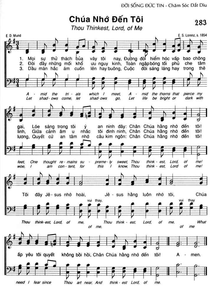 1. Mọi sự thử thách bủa vây tôi nay, Đường đời hiểm hóc vấp bao chông gai, Lóe sáng trong tôi ý an ninh đây: Chân Chúa hằng nhớ đến tôi! 2. Đời đầy những mối khổ ưu nguy kinh, Toàn ngập bóng tối phủ che tâm linh, Giữa cảnh âm u nhắc tôi đinh ninh, Chân Chúa hằng nhớ đến tôi! 3. Dầu màn hắc ám cuốn lên hay buông, Cuộc đời sáng láng hay trong thê lương, Quyết cứ an tâm nhớ câu kim ngôn: Chân Chúa hằng nhớ đến tôi! Điệp khúc: Tôi đây Jê-sus nhớ hoài, Jê-sus hằng luôn nhớ tôi, Chúa ấp yêu tôi quyết không bồi hồi, Chân Chúa hằng nhớ đến tôi! A-men.