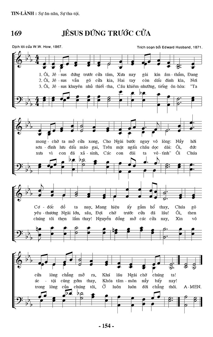 1. Ôi, Jêsus đứng trước cửa tâm, Xưa nay gài kín âm - thẩm, Đang mong chờ ta mở cửa xong, Cho Ngài bước ngay vô lòng: Nầy hỡi Cơ - đốc đồ ta nay, Mang hiệu ấy gẫm hổ thay, Chúa gõ cửa lòng chẳng mở ra, Khá lâu Ngài chờ chúng ta! 2. Ôi, Jê-sus vẫn gõ cửa kia, Hai tay còn dấu định kìa, Nơi sơn - đình lưu dấu mão gai, Trên mặt ngấn châu dọc dài: Ôi, đức yêu - thương Ngài lớn, sâu, Đợi chờ trước cửa đã lâu! Ôi, then ác tội cũng gồm thay, Khóa tâm môn nầy bấy nay! 3. Ôi, Jêsus khuyên nhủ thiết tha, Câu khiêm nhường, tiếng ôn hòa: "Ta xưa vì con đã xả sinh, Các con đãi ta vô - tình" Ôi Chúa chúng tôi thẹn lắm thay! Nguyễn đồng mở các cửa nay, Xin vô trong lòng của chúng tôi, Ở luôn luôn đời chẳng thôi. A-MEN.