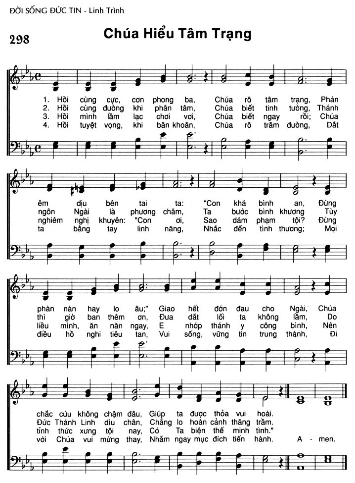 1. Hồi cùng cực, cơn phong ba, Chúa rõ tâm trạng, Phán êm dịu bên tai ta: "Con khá bình an, Đừng phàn nàn hay lo âu;" Giao hết đớn đau cho Ngài, Chúa chắc cứu không chậm đâu, Giúp ta được thỏa vui hoài. 2. Hồi cùng đường khi phân tâm, Chúa biết tình tường, Thánh ngôn Ngài là phương châm, Ta bước bình khương Tùy thì giờ ban thêm ơn, Đưa dắt lối ta không lầm, Chúa Đức Thánh Linh dìu chân, Chẳng lo hoàn cảnh thăng trầm. 3. Hồi mình lầm lạc chơi vơi, Chúa biết ngay rồi: Chúa nghiêm nghị khuyên: "Con ơi, Sao dám phạm tội? Đừng liều mình, ăn năn ngay, E nhớp thánh y công bình, Nên tỉnh thức xưng tội nay, Có Ta biện thế minh tình." 4. Khi tuyệt vọng, khi băn khoăn, Chúa rõ trăm đường, Dắt ta bằng tay linh năng, Nhắc đến tình thương; Mọi điều hồ nghi tiêu tan, Vui sống, vững tin trung thành, Đi với Chúa vui mừng thay, Nhắm ngay mục đích tiến hành. Outro: A - men.