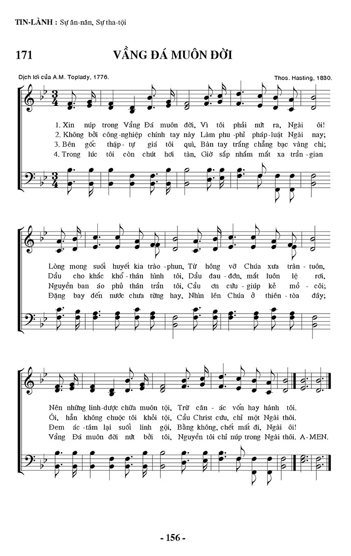 1. Xin núp trong Vầng Đá muôn đời, Vì tôi phải nứt ra, Ngài ôi! Lòng mong suối huyết kia trào phun, Từ hông vỡ Chúa xưa trần - tuôn, Nên những linh-dược chữa muôn tội, Trừ căn ác vốn hay hành tôi. 2. Không bởi công nghiệp chính tay này Làm phu phỉ pháp luật Ngài nay; Dầu cho khắc khổ - thân hình tôi, Dầu đau đớn, mất luôn lệ rơi, Ôi, hẳn không chuộc tôi khỏi tội, Cầu Christ cứu, chỉ một Ngài thôi, 3. Bên gốc thập tự giá tôi quì, Bàn tay trắng chẳng bạc vàng chỉ; Nguyễn ban áo phủ thân trần tôi, Cầu ơn cứu - giúp kẻ mồ côi; Đem ác tâm lại suối linh gội, Bằng không, chết mất đi, Ngài ôi! 4. Trong lúc tôi còn chút hơi tàn, Giờ sắp nhắm mắt xa trần - gian Đặng bay đến nước chưa từng hay, Nhìn lên Chúa ở thiên tòa đây; Vầng Đá muôn đời nứt bởi tôi, Nguyễn tôi chỉ núp trong Ngài thôi. A-MEN.