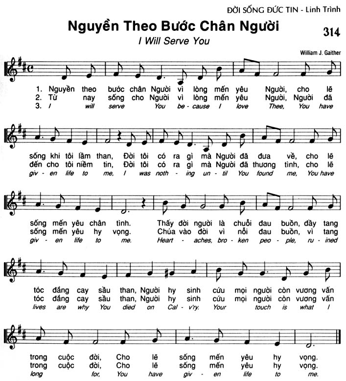 1. Nguyền theo bước chân Người vì lòng mến yêu Người, cho lẽ sống khi tôi lầm than, Đời tôi có ra gì mà Người đã đưa về, cho lẽ sống mến yêu chân tình. Thấy đời người là chuỗi đau buồn, đầy tang tóc đắng cay sầu than, Người hy sinh cứu mọi người còn vương vấn trong cuộc đời, Cho lẽ sống mến yêu hy vọng. 2. Từ nay sống cho Người vì lòng mến yêu Người, Người đã đến cho tôi niềm tin, Đời tôi có ra gì mà Người đã thương tình, cho lẽ sống mến yêu hy vọng. Chúa vào đời vì nỗi đau buồn, vì tang tóc đắng cay sầu than, Người hy sinh cứu mọi người còn vương vấn trong cuộc đời, Cho lẽ sống mến yêu hy vọng. 3. I will serve You because I love Thee, You have given life to me, I was nothing until You found me, You have given life to me. Heartaches, broken people, ruined lives are why You died on Calv'ry. Your touch is what I long for, You have given life to me.