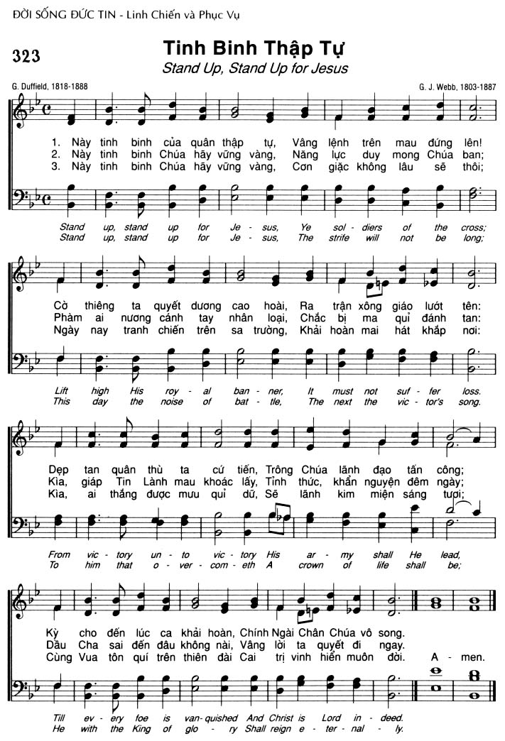 1. Này tinh binh của quân thập tự, Vâng lệnh trên mau đứng lên! Cờ thiêng ta quyết dương cao hoài, Ra trận xông giáo lướt tên: Dẹp tan quân thù ta cứ tiến, Trông Chúa lãnh đạo tấn công; Kỳ cho đến lúc ca khải hoàn, Chính Ngài Chân Chúa vô song. 2. Này tinh binh Chúa hãy vững vàng, Năng lực duy mong Chúa ban; Phàm ai nương cánh tay nhân loại, Chắc bị ma quỉ đánh tan: Kìa, giáp Tin Lành mau khoác lấy, Tỉnh thức, khẩn nguyện đêm ngày; Dầu Cha sai đến đâu không nài, Vâng lời ta quyết đi ngay. 3. Này tinh binh Chúa hãy vững vàng, Cơn giặc không lâu sẽ thôi; Ngày nay tranh chiến trên sa trường, Khải hoàn mai hát khắp nơi: Kìa, ai thắng được mưu quỉ dữ, Sẽ lãnh kim miện sáng tươi; Cùng Vua tôn quí trên thiên đài Cai trị vinh hiển muôn đời. Điệp khúc: Stand up, stand up for Jesus, Ye soldiers of the cross; Lift high His royal banner, It must not suffer loss. From victory unto victory His army shall He lead, Till every foe is vanquished And Christ is Lord indeed. Stand up, stand up for Jesus, The strife will not be long; This day the noise of battle, The next the victor's song. To him that overcometh A crown of life shall be; He with the King of glory Shall reign eternally. Amen.