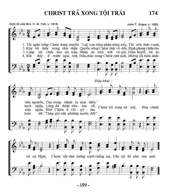 1. Tôi nghe tiếng Christ đang truyền: "Lực con trăm phần ương yếu, Thì nên thức canh, tâm nguyền, Tìm trong chính ta mọi điều." 2. Rày tôi thấy trong tâm thần Quyền năng Christ thật vô đối; Bịnh phung chữa cho sạch ngần, Lòng đá đánh tiêu tan rồi. Christ trả xong tội - trái, Nay chính 3. Lòng tôi chứa bao tội trần, Nhận ơn trên trời vô giá, Dầm huyết, tôi áo tinh ngần, Nhờ Chiên ở Gô-gô- tha. 4. Rồi đây ở trước ngai trời, Hồn, thân trong Christ tươi mới, Miệng tôi luôn nhắc luôn lời: "Thập giá cứu phương muôn đời!" Điệp khúc: tôi nợ Ngài; Christ tẩy tâm dường tuyết chẳng sai, Dẫu tội đỏ như son mài.