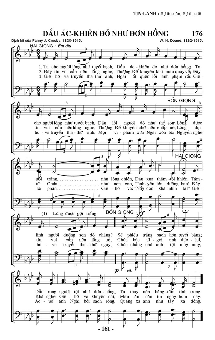 1. Ta cho ngươi lòng như tuyết bạch, Dầu ác - khiên đỏ như đơn hồng; Ta cho ngươi lòng như tuyết bạch, Dầu lỗi ngươi đỏ như thể son; Lòng được gọi trắng như lông chiên, Dầu xưa thắm tội khiên. Tâm linh ngươi dường son đỏ chăng? Sẽ phiếu trắng sạch hơn tuyết băng; Dẫu trong ngươi tội như đơn - hồng, Ta thay nên băng tâm tỉnh trong. 2. Đây tin vui cần nên lắng nghe, Thượng Đế khuyên khá mau quay về; Đây tin vui cần nên lắng nghe, Thượng - Đế khuyên chở nên chấp - nê; Lòng từ Chúa như non cao, Tình yêu lớn dường bao! Đây tin vui cần nên lắng tai, Chúa bác ái gọi anh đáo lai, Khá nghe Giê hô-va khuyên nài, Mau ăn năn tin ngay hôm nay. 3. Giê - hô - va truyền tha thứ anh, Ngài ất quên lỗi anh phạm rồi: Giê - hô - va truyền tha - thứ anh, Mọi vi - phạm xưa Ngài xóa bôi. Lời phán Giê hô va: "Nầy con khá nhìn ta!" Giê hô va truyền tha thứ ngay, Chúa chẳng nhớ anh tội mảy may, Ác uế anh Ngài bôi sạch ròng, Quăng xa anh như tây xa đông.
