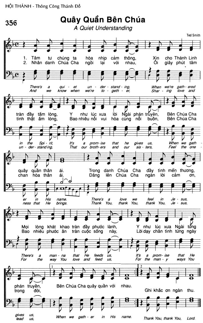 1. Tâm tư chúng ta hòa nhịp cảm thông, Xin cho Thánh Linh tràn đầy tấm lòng, quây quần thân ái. Mọi lòng khát khao tràn đầy phước lành, phán truyền, trong đời, 2. Nhân danh Chúa Cha ngồi lại với nhau, Ôi giây phút tâm tình thật ấm lòng, chan hòa thân ái. Bao nhiêu phước ân tràn cuộc sống này, Lời dạy chân tình từng ngày Điệp khúc: Y như lúc xưa lời Ngài phán truyền, Bên Chúa Cha Y như lúc xưa Ngài từng Bên Chúa Cha quây quần với nhau. Ghi khắc ơn ngàn thu.