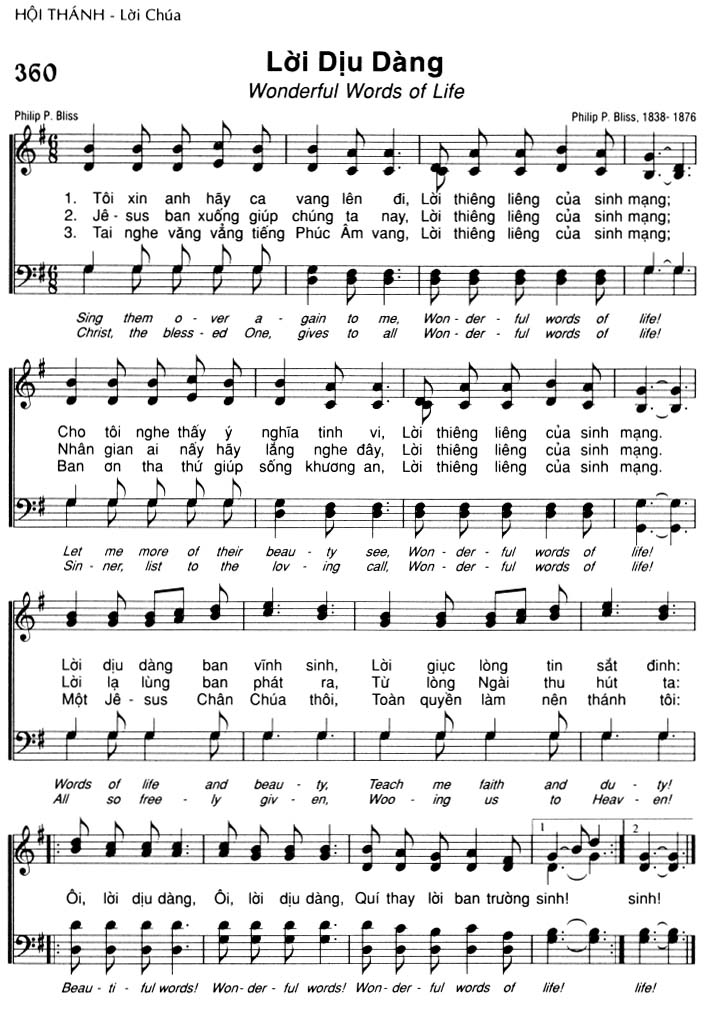 1. Tôi xin anh hãy ca vang lên đi, Lời thiêng liêng của sinh mạng; Cho tôi nghe thấy ý nghĩa tỉnh vi, Lời thiêng liêng của sinh mạng. Lời dịu dàng ban vĩnh sinh, Lời giục lòng tin sắt đinh: 2. Jêsus ban xuống giúp chúng ta nay, Lời thiêng liêng của sinh mạng; Nhân gian ai nấy hãy lắng nghe đây, Lời thiêng liêng của sinh mạng. Lời lạ lùng ban phát ra, Từ lòng Ngài thu hút ta: 3. Tai nghe văng vẳng tiếng Phúc Âm vang, Lời thiêng liêng của sinh mạng; Ban ơn tha thứ giúp sống khương an, Lời thiêng liêng của sinh mạng. Một Jêsus Chân Chúa thôi, Toàn quyền làm nên thánh tôi: Điệp khúc: Ôi, lời dịu dàng, Ôi, lời dịu dàng, Quí thay lời ban trường sinh! sinh!