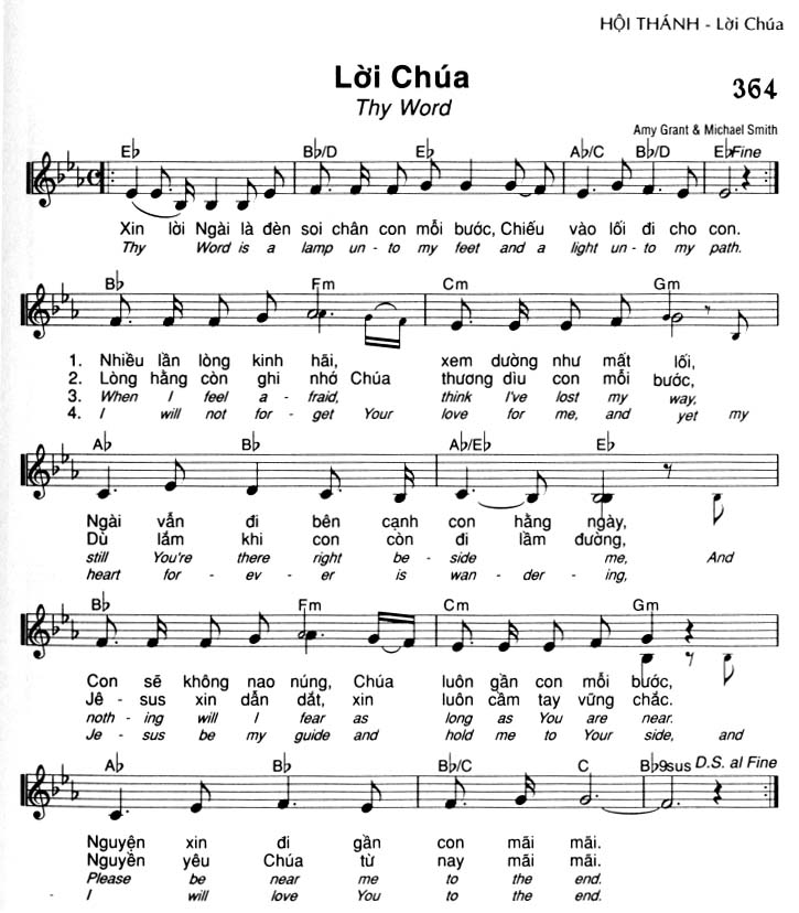 1. Xin lời Ngài là đèn soi chân con mỗi bước, Chiếu vào lối đi cho con. Nhiều lần lòng kinh hãi, xem dường như mất lối, Ngài vẫn đi bên cạnh con hằng ngày, Con sẽ không nao núng, Chúa luôn gần con mỗi bước, Nguyện xin đi gần con mãi mãi. 2. Xin lời Ngài là đèn soi chân con mỗi bước, Chiếu vào lối đi cho con. Lòng hằng còn ghi nhớ Chúa thương dìu con mỗi bước, Dù lắm khi con còn đi lầm đường, Jêsus xin dẫn dắt, xin luôn cầm tay vững chắc. Nguyện yêu Chúa từ nay mãi mãi. 3. Thy Word is a lamp unto my feet and a light unto my path. When I feel afraid, think I've lost my way, Still You're there right beside me, Nothing will I fear as long as You are near. Please be near me to the end. 4. Thy Word is a lamp unto my feet and a light unto my path. I will not forget Your love for me, and yet my heart for ever is wandering, Jesus be my guide and hold me to Your side, I will love You to the end.