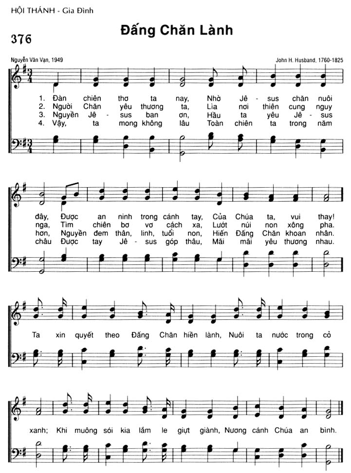 1. Đàn chiên thơ ta nay, Nhờ Jê-sus chăn nuôi đây, Được an ninh trong cánh tay, Của Chúa ta, vui thay! 2. Người Chăn yêu thương ta, Lia nơi thiên cung nguy nga, Tìm chiên bơ vơ cách xa, Lướt núi non xông pha. 3. Nguyền Jê-sus ban ơn, Hầu ta yêu Jê-sus hơn, Nguyền đem thân, linh, tuổi non, Hiến Đấng Chăn khoan nhân. 4. Vậy, ta mong không lâu Toàn chiên ta trong năm châu Được tay Jê-sus góp thâu, Mãi mãi yêu thương nhau. Điệp khúc: Ta xin quyết theo Đấng Chăn hiền lành, Nuôi ta nước trong cỏ xanh; Khi muông sói kia lắm le giựt giành, Nương cánh Chúa an bình.