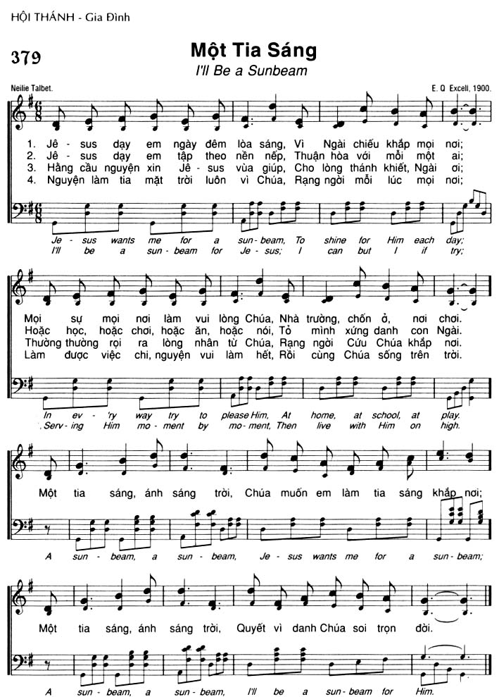 1. Jê-sus dạy em ngày đêm lòa sáng, Vì Ngài chiếu khắp mọi nơi; Mọi sự mọi nơi làm vui lòng Chúa, Nhà trường, chốn ở, nơi chơi. 2. Jê-sus dạy em tập theo nền nếp, Thuận hòa với mỗi một ai; Hoặc học, hoặc chơi, hoặc ăn, hoặc nói, Tỏ mình xứng danh con Ngài. 3. Hằng cầu nguyện xin Jê-sus vừa giúp, Cho lòng thánh khiết, Ngài ơi; Thường thường rọi ra lòng nhân từ Chúa, Rạng ngời Cứu Chúa khắp nơi. 4. Nguyện làm tia mặt trời luôn vì Chúa, Rạng ngời mỗi lúc mọi nơi; Làm được việc chi, nguyện vui làm hết, Rồi cùng Chúa sống trên trời. Điệp khúc: Một tia sáng, ánh sáng trời, Chúa muốn em làm tia sáng khắp nơi; Một tia sáng, ánh sáng trời, Quyết vì danh Chúa soi trọn đời.