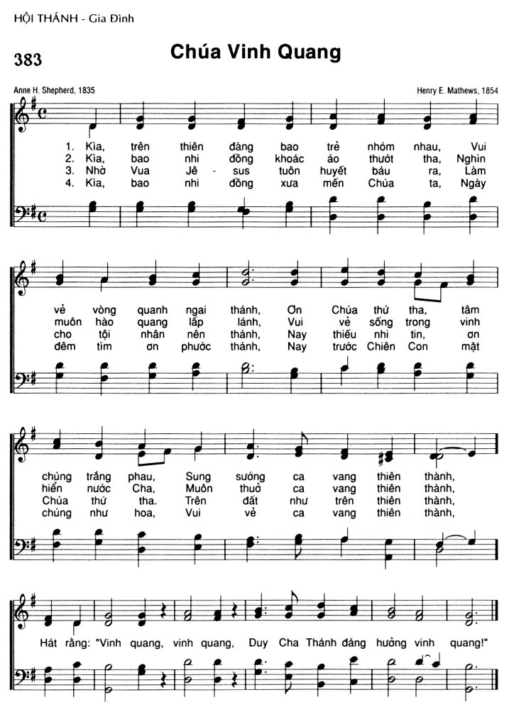 1. Kìa, trên thiên đàng bao trẻ nhóm nhau, Vui vẻ vòng quanh ngai thánh, Ơn Chúa thứ tha, tâm chúng trắng phau, Sung sướng ca vang thiên thành, 2. Kìa, bao nhi đồng khoác áo thướt tha, Nghìn muôn hào quang lấp lánh, Vui vẻ sống trong vinh hiển nước Cha, Muôn thuở ca vang thiên thành, 3. Nhờ Vua Jê Sus tuôn huyết báu ra, Làm cho tôi nhân nên thánh, Nay thiếu nhi tin, ơn Chúa thứ tha. Trên đất như trên thiên thành, 4. Kìa, bao nhi đồng xưa mến Chúa ta, Ngày đêm tìm ơn phước thánh, Nay trước Chiên Con mặt chúng như hoa, Vui vẻ ca vang thiên thành, Điệp khúc: Hát rằng: "Vinh quang, vinh quang, Duy Cha Thánh đáng hưởng vinh quang!"