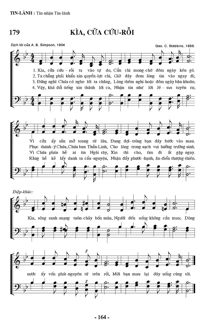 1. Kìa, cửa cứu-rỗi ta vào tự do, Cần chi mong-chờ đêm ngày kêu gõ Vì cửa ấy sẵn mở toang từ lâu, Đang đợi trông bạn đây bước vào mau. 2. Ta chẳng phải khẩn-xin quyền-lực chi, Giờ đây đem lòng tin vào ngay đi Phục thánh-ý Chúa, Chúa ban Thần-Linh, Cho lòng trong sạch vui hưởng trường-sinh. 3. Đừng nghĩ Chúa có nghe lời ta chăng, Lòng thêm nghi-hoặc đêm ngày băn-khoăn Vì Chúa phán hễ ai tin Ngài rày, Xin thì cho, tìm đi ắt gặp ngay. 4. Vậy, khá dõi tiếng xin thành lời ca, Nhận tin như lời Jê-sus tuyên ra Rằng hễ kẻ lấy danh ta cầu-nguyện, Nhận đầy phước-hạnh, ân-điển thượng-thiên. ĐK: Kìa, sông sanh-mạng tuôn-chảy bốn mùa, Người đến uống không cần mua Dòng nước ấy vốn phát-nguyên từ trên trời, Mời bạn mau lại đây uống cùng tôi.