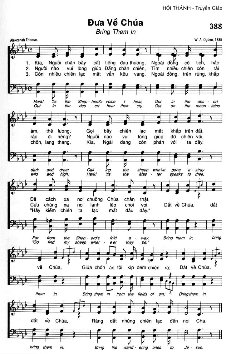 1. Kìa, Người chăn bầy cất tiếng đau thương, Ngoài đồng cô tịch, hắc ám, thê lương, Gọi bầy chiên lạc mất khắp trên đất, Đã cách xa nơi chuồng Chúa chân thật. 2. Người nào vui lòng giúp Đấng chăn chiên, Tìm nhiều chiên còn rác đi riêng? Người nào vui lòng giúp đỡ chiên với, Cứu chúng xa nơi lạnh lẽo chơi vơi. 3. Còn nhiều chiên lạc mất vẫn kêu vang, Ngoài đồng, trên rừng, khắp chốn, lang thang, Kìa, Ngài đang còn phán với ta đấy, "Hãy kiếm chiên ta lạc mất đâu đây." Điệp khúc: Dắt về Chúa, dắt về Chúa, Giữa chốn ác tội kíp đem chiên ra; Dắt về Chúa, Ráng dắt những chiên lạc đến nơi Cha.