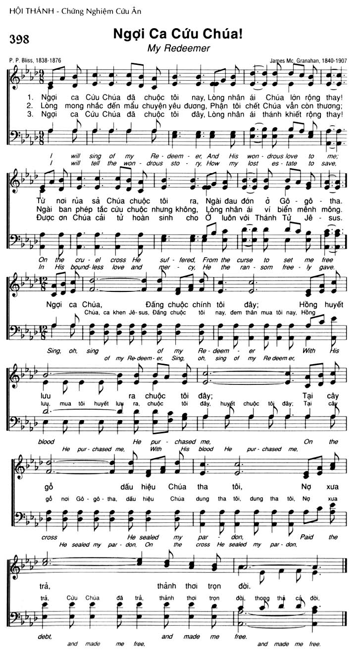 1. Ngợi ca Cứu Chúa đã chuộc tôi nay, Lòng nhân ái Chúa lớn rộng thay! Từ nơi rủa sả Chúa chuộc tôi ra, Ngài đau đớn ở Gô-gô-tha. Ngợi ca Chúa, Đấng chuộc chính tôi đây: Hồng huyết lưu ra chuộc tôi đây; Tại cây gỗ dấu hiệu Chúa tha tôi, Nợ xưa trả, thành thơi trọn đời. 2. Lòng mong nhắc đến mẫu chuyện yêu đương, Phận tôi chết Chúa vẫn còn thương; Ngài ban phép tắc cứu chuộc nhưng không, Lòng nhân ái ví biển mênh mông. Chúa, ca khen Jê-sus, Đấng chuộc tôi nay, đem thân mua tôi nay. Hồng huyết luy ra, chuộc tôi đây, huyết chuộc tôi đây: Tại cây gỗ nơi Gô-gô-tha, dấu hiệu Chúa dung tha tôi, dung tha tôi, Nợ xua trả, Cứu Chúa đã trả, thành thơi trọn đời, thong thả cả đời. 3. Ngợi ca Cứu Chúa đã chuộc tôi đây, Lòng nhân ái thánh khiết rộng thay! Được ơn Chúa cải tử hoàn sinh cho ở luôn với Thánh Tử Jê-sus. Điệp khúc: Ngợi ca Chúa, Đấng chuộc chính tôi đây: Hồng huyết lưu ra chuộc tôi đây; Tại cây gỗ dấu hiệu Chúa tha tôi, Nợ xưa trả, thành thơi trọn đời.