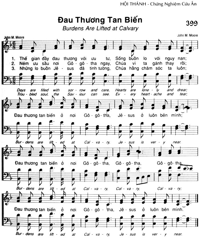 1. Thế gian đầy đau thương với ưu tư, Sống buồn lo với nguy nan; Days are filled with sorrow and care, Hearts are lonely and drear; 2. Ném ưu sầu nơi Gô - gô - tha ngay, Chúa vì ta gánh thay rồi; Troubled soul, the Saviour can see. Every heartache and tear; 3. Những lo buồn Jê - sus đã tinh tường, Chúa hằng chăm sóc ta luôn; Điệp khúc: Đau thương tan biến ở nơi Gô - gô - tha, Jê - sus ở luôn bên mình; Burdens are lifted at Calvary. Je - sus is very near. Đau thương tan biến ở nơi Gô - gô - tha, Gô - gô - tha, Gô - gô - tha Burdens are lifted at Calvary. Calvary. Calvary: Đau thương tan biến ở nơi Gô - gô - tha, Jê - sus ở luôn bên mình. Burdens are lifted at Calvary. Je - sus is very near.
