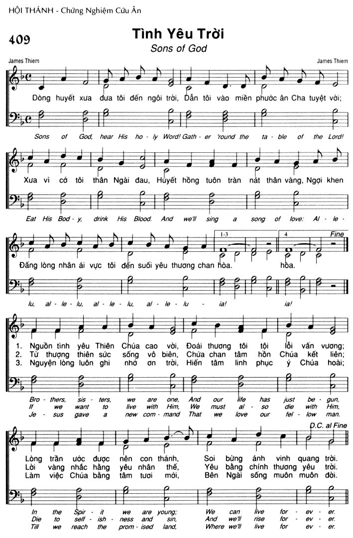 1. Nguồn tình yêu Thiên Chúa cao vời, Đoái thương tôi tội lỗi vấn vương; Lòng trần ước được nên con thánh, Soi bừng ánh vinh quang trời. 2. Từ thượng thiên sức sống vô biên, Chứa chan tâm hồn Chúa kết liên; Lời vàng nhắc hằng yêu nhân thế, Yêu bằng chính thương yêu trời. 3. Nguyện lòng luôn ghi nhớ ơn trời, Hiến tâm linh phục ý Chúa hoài; Làm việc Chúa bằng tâm tươi mới, Bên Ngài sống muôn muôn đời. Điệp khúc: Dòng huyết xưa đưa tôi đến ngôi trời, Dẫn tôi vào miền phước ân Cha tuyệt vời; Xưa vì có tôi thân Ngài đau, Huyết hồng tuôn tràn nát thân vàng, Ngợi khen Đấng lòng nhân ái vực tôi đến suối yêu thương chan hòa.