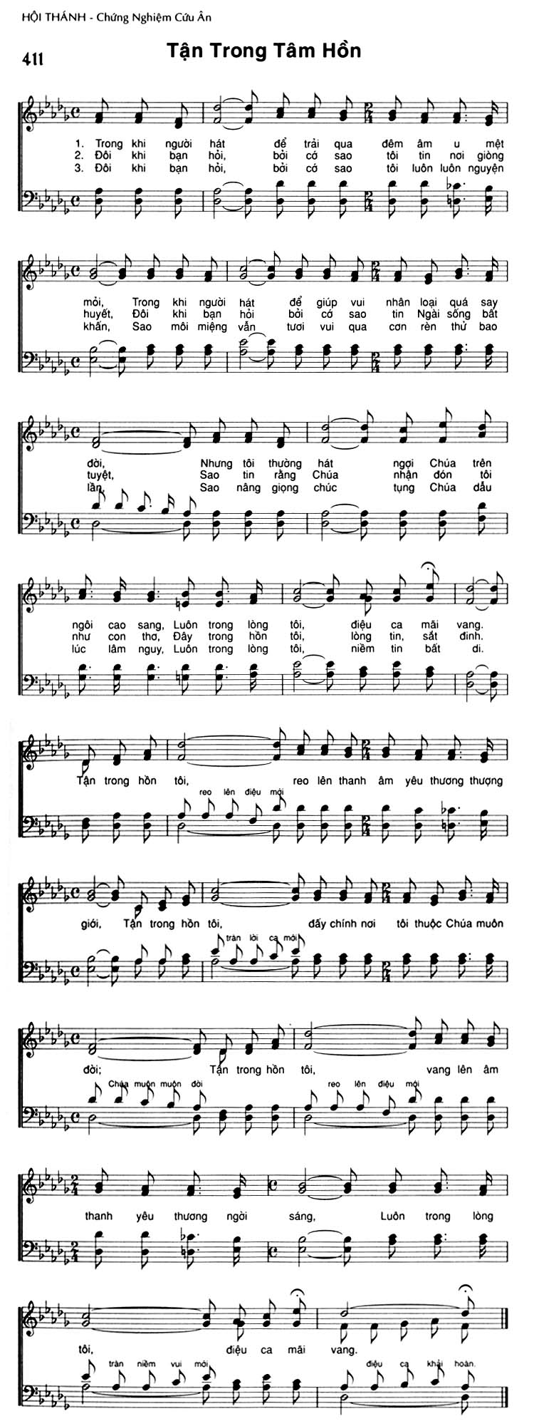 1. Trong khi người hát để trải qua đêm âm u mệt mỏi, Trong khi người hát để giúp vui nhân loại quá say đời, Nhưng tôi thường hát ngợi Chúa trên ngôi cao sang, Luôn trong lòng tôi, điệu ca mãi vang. 2. Đôi khi bạn hỏi, bởi có sao tôi tin nơi giòng huyết, Đôi khi bạn hỏi bởi có sao tin Ngài sống bất tuyệt, Sao tin rằng Chúa nhận đón tôi như con thơ, Đây trong hồn tôi, lòng tin, sắt dinh. 3. Đôi khi bạn hỏi, bởi có sao tôi luôn luôn nguyện khẩn, Sao môi miệng vẫn tươi vui qua cơn rèn thử bao lần, Sao nâng giọng chúc tụng Chúa dẫu lúc lâm nguy, Luôn trong lòng tôi, niềm tin bất di. chorus. Tận trong hồn tôi, reo lên thanh âm yêu thương thượng giới, Tận trong hồn tôi, đấy chính nơi tôi thuộc Chúa muôn đời; Tận trong hồn tôi, vang lên âm thanh yêu thương ngời sáng, Luôn trong lòng tôi, điệu ca mãi vang. Trần niềm vui mới, điệu ca khải hoàn. Điệp khúc: Tận trong hồn tôi, reo lên thanh âm yêu thương thượng giới, Tận trong hồn tôi, đấy chính nơi tôi thuộc Chúa muôn đời; Tận trong hồn tôi, vang lên âm thanh yêu thương ngời sáng, Luôn trong lòng tôi, điệu ca mãi vang. Trần niềm vui mới, điệu ca khải hoàn.