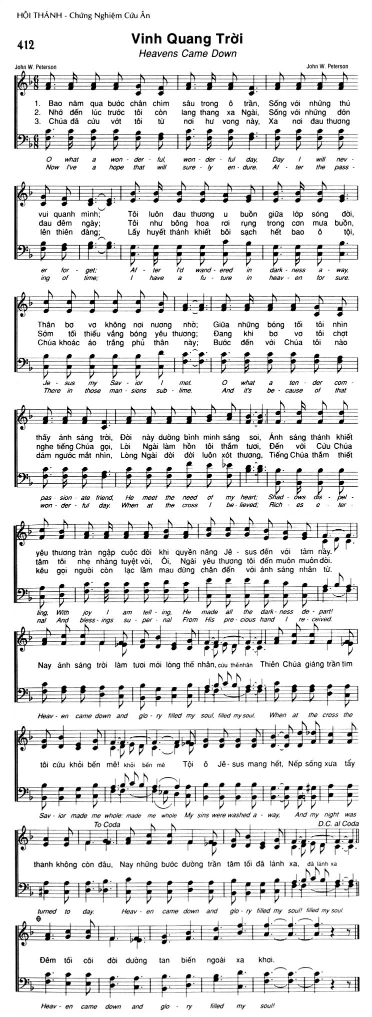 1. Bao năm qua bước chân chìm sâu trong ô trần, Sống với những thú vui quanh mình; Tôi luôn đau thương u buồn giữa lớp sóng đời, Thân bơ vơ không nơi nương nhờ; Giữa những bóng tối tôi nhìn thấy ánh sáng trời, Đời này dường bình minh sáng soi, Ánh sáng thánh khiết yêu thương tràn ngập cuộc đời khi quyền năng Jêsus đến với tâm này. 2. Nhớ đến lúc trước tôi còn lang thang xa Ngài, Sống với những đớn đau đêm ngày; Tôi như bông hoa rơi rụng trong cơn mưa buồn, Sớm tối thiếu vắng bóng yêu thương; Đang khi bơ vơ tôi chợt nghe tiếng Chúa gọi, Lời Ngài làm hồn tôi thắm tươi, Đến với Cứu Chúa tâm tôi nhẹ nhàng tuyệt vời, Ôi, Ngài yêu thương tôi đến muôn muôn đời. 3. Chúa đã cứu vớt tôi từ nơi hư vong này, Xa nơi đau thương lên thiên đàng; Lấy huyết thánh khiết bôi sạch hết bao ô tội, Chúa khoác áo trắng phủ thân này; Bước đến với Chúa tôi nào dám ngước mắt nhìn, Lòng Ngài đời đời luôn xót thương, Tiếng Chúa thắm thiết kêu gọi người còn lạc làm mau dừng chân đến với ánh sáng nhân từ. Điệp khúc: Nay ánh sáng trời làm tươi mới lòng thế nhân, cứu thế nhân Thiên Chúa giáng trần tìm tôi cứu khỏi bến mê! khỏi bến mê Tội ô Jê-sus mang hết, Nếp sống xưa tẩy thanh không còn đâu, Nay những bước đường trần tăm tối đã lánh xa, đã lánh xa Đêm tối cõi đời dường tan biến ngoài xa khơi.
