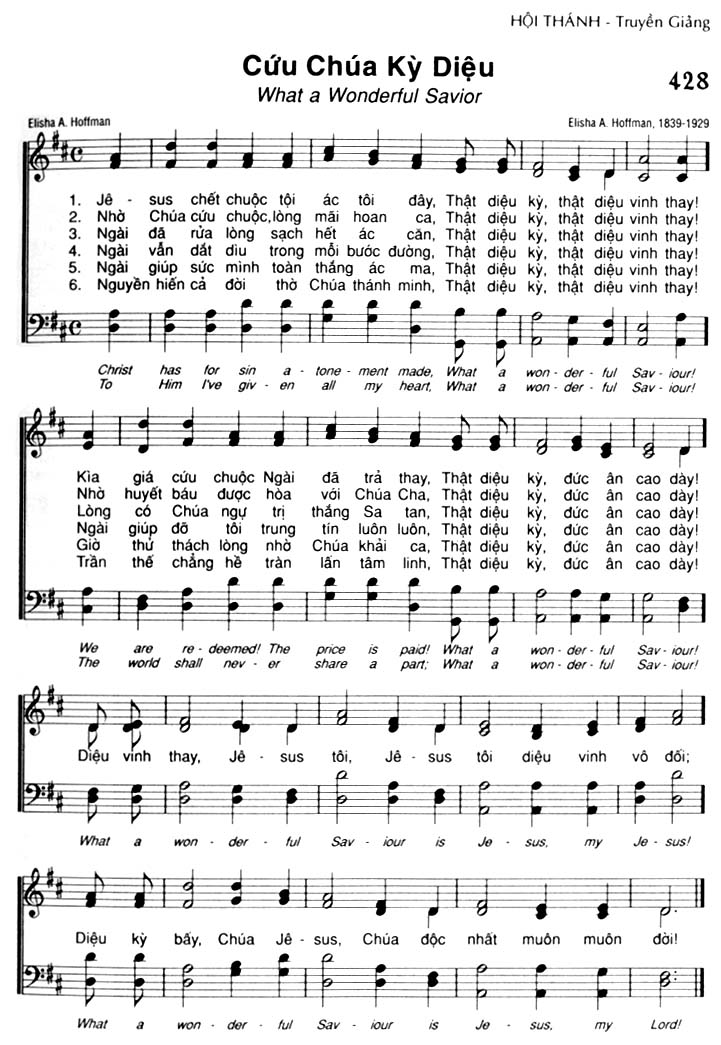 1. Jê-sus chết chuộc tội ác tôi đây, Thật diệu kỳ, thật diệu vinh thay! Kia giá cứu chuộc Ngài đã trả thay. Thật diệu kỳ, đức ân cao dày! 2. Nhờ Chúa cứu chuộc, lòng mãi hoan ca, Thật diệu kỳ, thật diệu vinh thay! Nhờ huyết báu được hòa với Chúa Cha, Thật diệu kỳ, đức ân cao dày! 3. Ngài đã rửa lòng sạch hết ác căn, Thật diệu kỳ, thật diệu vinh thay! Lòng có Chúa ngự trị thắng Sa-tan, Thật diệu kỳ, đức ân cao dày! 4. Ngài vẫn dắt dìu trong mỗi bước đường, Thật diệu kỳ, thật diệu vinh thay! Ngài giúp đỡ tôi trung tín luôn luôn, Thật diệu kỳ, đức ân cao dày! 5. Ngài giúp sức mình toàn thắng ác ma, Thật diệu kỳ, thật diệu vinh thay! Giờ thử thách lòng nhờ Chúa khải ca, Thật diệu kỳ, đức ân cao dày! 6. Nguyện hiến cả đời thờ Chúa thánh minh, Thật diệu kỳ, thật diệu vinh thay! Trần thế chẳng hề trần lẫn tâm linh, Thật diệu kỳ, đức ân cao dày! Điệp khúc: Diệu vinh thay, Jê-sus tôi, Jê-sus tôi diệu vinh vô đối; Diệu kỳ bấy, Chúa Jê-sus, Chúa độc nhất muôn muôn đời!