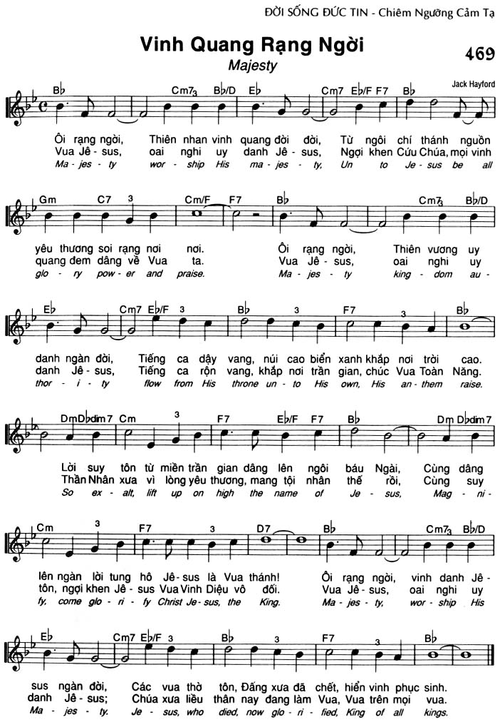1. Ôi rạng ngời, Thiên nhan vinh quang đời đời, Từ ngôi chí thánh nguồn yêu thương soi rạng nơi nơi. Ôi rạng ngời, Thiên vương uy danh ngàn đời, Tiếng ca dậy vang, núi cao biển xanh khắp nơi trời cao. Lời suy tôn từ miền trần gian dâng lên ngôi báu Ngài, Cùng dâng lên ngàn lời tung hô Jê-sus là Vua thánh! Ôi rạng ngời, vinh danh Jê-sus ngàn đời, Các vua thờ tôn, Đấng xưa đã chết, hiển vinh phục sinh. 2. Vua Jê-sus, oai nghi uy danh Jê-sus, Ngợi khen Cứu Chúa, mọi vinh quang đem dâng về Vua ta. Vua Jê-sus, oai nghi uy danh Jê-sus, Tiếng ca rộn vang, khắp nơi trần gian, chúc Vua Toàn Năng. Thần Nhân xưa vì lòng yêu thương, mang tội nhân thế rồi, Cùng suy tôn, ngợi khen Jê-sus Vua Vinh Diệu vô đối. Vua Jê-sus, oai nghi uy danh Jê-sus; Chúa xưa liều thân nay đang làm Vua, Vua trên mọi vua. 3. Ma - jes - ty, wor - ship His ma - jes - ty, Un - to Je - sus be all glo - ry power and praise. Ma - jes - ty king - dom au - thor - i - ty flow from His throne un - to His own, His an - them raise. So ex - alt, lift up on high the name of Je - sus, Mag - ni - fy, come glo - ri - fy Christ Jesus, the King. Ma - jes - ty, wor - ship His Ma - jes - ty. Je - sus, who died, now glo - ri - fied, King of all kings.