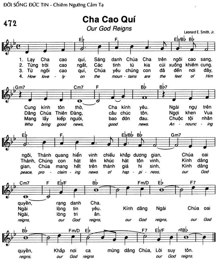 1. Lạy Cha cao quí, Sáng danh Chúa Cha trên ngôi cao sang, Cung kính tôn thờ, Cha kính yêu. Ngài ngự trên ngôi, Thánh quang hiển vinh chiếu khắp dương gian, quyền, rạng danh Cha. Kính dâng Ngài quyền, Khắp nơi ca mừng dâng Chúa, Lời suy tôn. 2. Từng trời cao ngất, Các tinh tú kia cúi xuống khiêm cung. Dâng Chúa Thiên Đàng, câu chúc tôn. Ngợi khen Vua Thánh, Chúng con hát lên khúc hát tôn vinh, Ngài lòng tin yêu. Chúa oai quyền, Khắp nơi ca mừng dâng Chúa, Lời suy tôn. 3. Từ ngôi cao quí, Chúa yêu chúng con đã đến nơi đây, Mang lấy kiếp người, bao đớn đau. Chuộc tội nhân gian, Chúa mang hết trên thánh giá hi sinh, Ngài lòng tri ân. Chúa oai quyền, Khắp nơi ca mừng dâng Chúa, Lời suy tôn. 4. How lovely on the mountains are the feet of Him Who bring good news, good news. Announcing peace, proclaiming news of happiness, our God reigns, our God reigns, our God reigns, our God reigns, our God reigns.