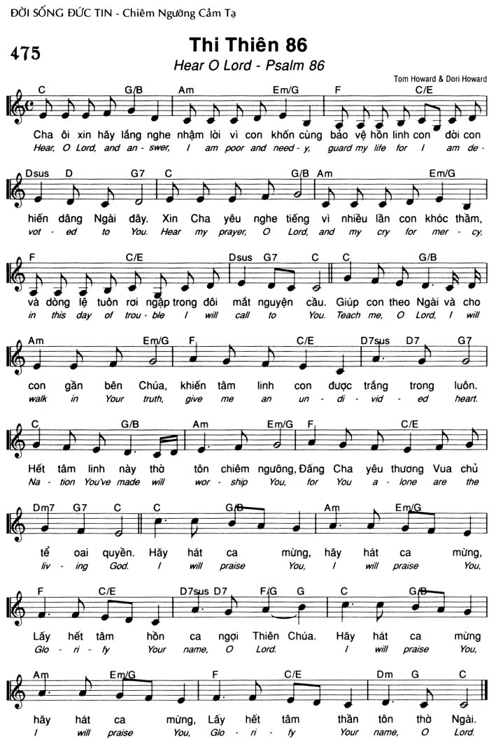1. Cha ôi xin hãy lắng nghe nhậm lời vì con khốn cùng bảo vệ hồn linh con đời con hiến dâng Ngài đây. Xin Cha yêu nghe tiếng vì nhiều lần con khóc thầm, và dòng lệ tuôn rơi ngập trong đôi mắt nguyện cầu. Giúp con theo Ngài và cho con gần bên Chúa, khiến tâm linh con được trắng trong luôn. Hết tâm linh này thờ tôn chiêm ngưỡng, Đấng Cha yêu thương Vua chủ tể oai quyền. Điệp khúc: Hãy hát ca mừng, hãy hát ca mừng, Lấy hết tâm hồn ca ngợi Thiên Chúa. Hãy hát ca mừng, Lấy hết tâm thần tôn thờ Ngài.
