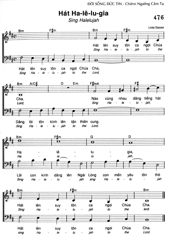 Điệp khúc: Hát lên suy tôn ca ngợi Chúa Cha, Sing Hallelujah to the Lord, Nào cùng nhau dâng tiếng hát Ha-lê-lu-jah, Dâng lời tôn kính lên tận thiên cung. Sing Hallelujah to the Lord. Ha-lê-lu-gia, Lời con kính dâng lên Ngài Lòng con mến yêu tôn thờ Sing Hallelujah sing Hallelujah Hát lên suy tôn ca ngợi Chúa Cha. Sing Hallelujah to the Lord. Hát lên suy tôn ca ngợi Chúa Cha. Sing Hallelujah to the Lord.