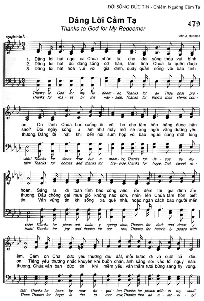 1. Dâng lời hát ngợi ca Chúa nhân từ, cho đời sống thỏa vui bình an, Ơn lành Chúa ban xuống ôi vô bờ cho tâm hồn hằng được hân hoan. Sáng ra đi toan tính bao công việc, rồi đêm tới gia đình ấm êm, Cám ơn Cha đức yêu thương dìu dắt, mỗi bước đi và suốt cả đời. 2. Dâng lời hát dù đang sống cơ hàn, tâm tình Chúa ta quên được sao? Đôi ngày sống u ám như mây mờ sẽ rạng ngời vầng dương yêu thương. Dẫu chông gai mưa gió không nao sờn, nhìn lên Chúa tâm hồn biết ơn, Tiếng yêu thương nhắc khuyên khi buồn chán, ánh sáng soi vào lối nguy nàn. 3. Dâng lời hát hòa vui với gia đình, quây quần sống với bao tình thương, Dâng lời hát khi đến nơi sum họp với bao người cùng một lòng tin. Vẫn vững tin khi sống xa quê nhà, hoặc ngăn cách bao người mến thương, Chúa vẫn ban đức tin khi mềm yếu, vẫn thắm tươi bừng sáng hy vọng.