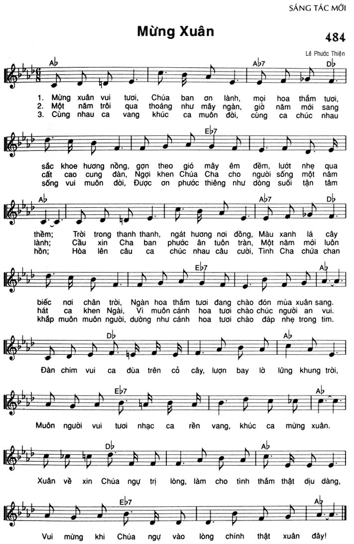 1. Mừng xuân vui tươi, Chúa ban ơn lành, mọi hoa thắm tươi, sắc khoe hương nồng, gợn theo gió mây êm đềm, lướt nhẹ qua thềm; Trời trong thanh thanh, ngát hương nơi đồng, Màu xanh lá cây biếc nơi chân trời, Ngàn hoa thắm tươi đang chào đón mùa xuân sang. Đàn chim vui ca đùa trên cỏ cây, lượn bay lờ lững khung trời, Muôn người vui tươi nhạc ca rền vang, khúc ca mừng xuân. Xuân về xin Chúa ngự trị lòng, làm cho tình thắm thật dịu dàng, Vui mừng khi Chúa ngự vào lòng chính thật xuân đây! 2. Một năm trôi qua thoáng như mây ngàn, giờ năm mới sang cất cao cung đàn, Ngợi khen Chúa Cha cho người sống một năm lành; Cầu xin Cha ban phước ân tuôn tràn, Một năm mới luôn hát ca khen Ngài, Vì muôn cánh hoa tươi chào chúc người an vui. Đàn chim vui ca đùa trên cỏ cây, lượn bay lờ lững khung trời, Muôn người vui tươi nhạc ca rền vang, khúc ca mừng xuân. Xuân về xin Chúa ngự trị lòng, làm cho tình thắm thật dịu dàng, Vui mừng khi Chúa ngự vào lòng chính thật xuân đây! 3. Cùng nhau ca vang khúc ca muôn đời, cùng ca chúc nhau sống vui muôn đời, Được ơn phước thiêng như dòng suối tận tâm hồn; Hòa lên câu ca chúc nhau câu cười, Tình Cha chứa chan khắp muôn muôn người, dường như cánh hoa tươi chào đáp nhẹ trong tim. Đàn chim vui ca đùa trên cỏ cây, lượn bay lờ lững khung trời, Muôn người vui tươi nhạc ca rền vang, khúc ca mừng xuân. Xuân về xin Chúa ngự trị lòng, làm cho tình thắm thật dịu dàng, Vui mừng khi Chúa ngự vào lòng chính thật xuân đây!
