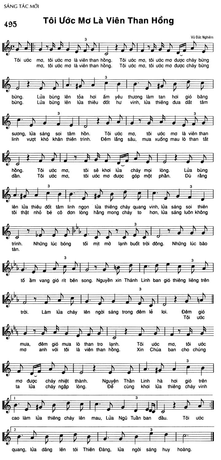 1. Tôi ước mơ, tôi ước mơ là viên than hồng. Tôi ước mơ, tôi ước mơ được cháy bừng bừng. Lửa bùng lên tỏa hơi ấm yêu thương làm tan hơi gió băng sương, lửa sáng soi tâm hồn. Tôi ước mơ, tôi ước mơ là viên than hồng. Tôi ước mơ, tôi sẽ khơi lửa cháy mọi lòng. Lửa bùng lên lửa thiêu đốt tâm linh ngọn lửa thiêng cháy quang vinh, lửa sáng soi thiên trình. Những lúc bóng tối mịt mờ lạnh buốt trời đông. Những lúc bão tố ầm vang gió rít bên song. Nguyền xin Thánh Linh ban gió thiêng liêng trên trời. Làm lửa cháy lên ngời sáng trong đêm lẻ loi. Đêm gió mưa, đêm gió mưa lò than tro lạnh. Tôi ước mơ, tôi ước mơ được cháy nhiệt thành. Nguyện Thần Linh hà hơi gió trên cao làm lửa thiêng cháy lên mau, Lửa Ngũ Tuần ban đầu. 2. Tôi ước mơ, tôi ước mơ là viên than hồng. Tôi ước mơ, tôi ước mơ được cháy bừng bừng. Lửa bùng lên lửa thiêu đốt hư vinh, lửa thiêng đưa dắt tâm linh vượt khó khăn thiên trình. Đêm lắng sâu, mưa xuống mau lò than tắt dần. Tôi ước mơ, tôi ước mơ được góp một phần. Dù rằng tôi thật nhỏ bé cô đơn lòng hằng mong cháy to hơn, lửa sáng luôn không tàn. Nguyền xin Thánh Linh ban gió thiêng liêng trên trời. Làm lửa cháy lên ngời sáng trong đêm lẻ loi. Đêm gió mưa, đêm gió mưa lò than tro lạnh. Xin Chúa ban cho chúng ta lửa cháy ngập lòng. Để cùng khơi lửa thiêng cháy vinh quang, lửa dâng lên tới Thiên Đàng, lửa ngời sáng huy hoàng.