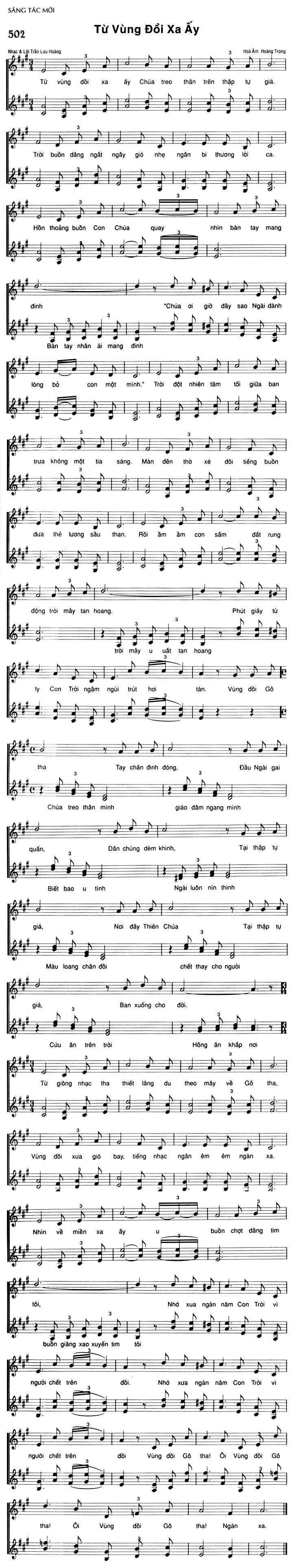 1. Từ vùng đồi xa ấy Chúa treo thân trên thập tự giá. Trời buồn dâng ngất ngây gió nhẹ ngân bị thương lời ca. Hồn thoảng buồn Con Chúa quay nhìn bàn tay mang đinh. Bàn tay nhân ái mang đinh. "Chúa ơi giờ đây sao Ngài đành lòng bỏ con một mình." Trời đột nhiên tăm tối giữa ban trưa không một tia sáng. Màn đền thờ xé đôi tiếng buồn đưa thê lương sầu than. Rồi ầm ầm cơn sấm đất rung động trời mây tan hoang. Phút giây từ ly Con Trời ngậm ngùi trút hơi tàn. 2. Vùng đồi Gô tha Tay chân đinh đóng, Đầu Ngài gai quần, Chúa treo thân mình giáo đâm ngang mình Dân chúng dèm khinh, Tại thập tự giá, Biết bao u tình Ngài luôn nín thinh. Nơi đây Thiên Chúa chết thay cho người Tại thập tự giá, Máu loang chân đồi Ban xuống cho đời. Cứu ân trên trời Hồng ân khắp nơi. 3. Từ giòng nhạc tha thiết lãng du theo mây về Gô tha, Vùng đồi xưa gió bay, tiếng nhạc ngân êm êm ngàn xa. Nhìn về miền xa ấy u buồn chợt dâng tim tôi, buồn giăng xao xuyến tim tôi Nhớ xưa ngàn năm Con Trời vì người chết trên đồi. Nhớ xưa ngàn năm Con Trời vì người chết trên đồi. Vùng đồi Gô tha! Ôi Vùng đồi Gô tha! Ôi Vùng đồi Gô tha! Ngàn xa.