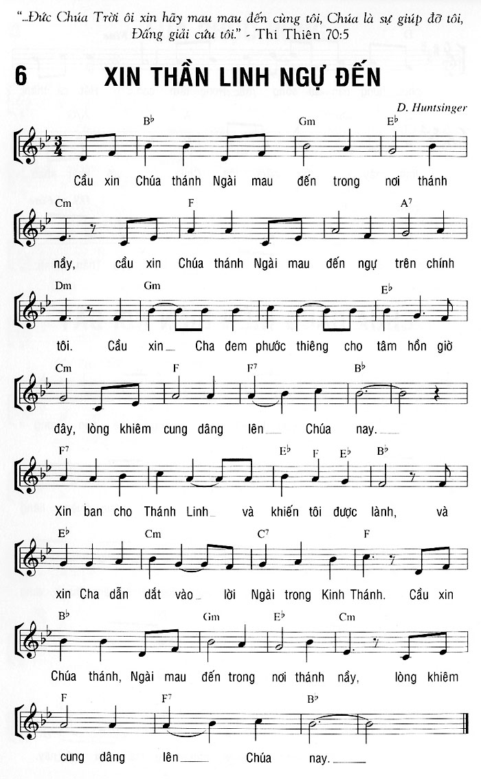1. Cầu xin Chúa thánh Ngài mau đến trong nơi thánh nầy, cầu xin Chúa thánh Ngài mau đến ngự trên chính tôi. Cầu xin Cha đem phước thiêng cho tâm hồn giờ đây, lòng khiêm cung dâng lên Chúa nay. Xin ban cho Thánh Linh và khiến tôi được lành, và xin Cha dẫn dắt vào lời Ngài trong Kinh Thánh. Cầu xin Chúa thánh, Ngài mau đến trong nơi thánh nầy, lòng khiêm cung dâng lên Chúa nay.