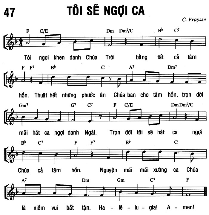 1. Tôi ngợi khen danh Chúa Trời bằng tất cả tâm hồn. Thuật hết những phước ân Chúa ban cho tâm hồn, trọn đời mãi hát ca ngợi danh Ngài. Trọn đời tôi sẽ hát ca ngợi Chúa cả tâm hồn. Nguyện mãi mãi xướng ca Chúa là niềm vui bất tận. Ha-lê-lu-gia! A-men!