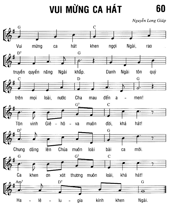 1. Vui mừng ca hát khen ngợi Ngài, rao truyền quyền năng Ngài khắp. Danh Ngài tôn quý trên mọi loài, nước Cha mau đến a - men! Tôn vinh Giê hô va muôn đời, khá hát! Chung dâng lên Chúa muôn loài bài ca mới. Ca khen ơn xót thương muôn loài, khá hát! Ha - lê - lu - gia kính khen Ngài.