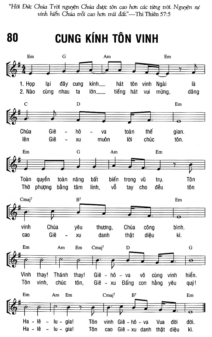1. Họp lại đây cung kính hát tôn vinh Ngài là Chúa Giê-hô-va toàn thế gian. Toàn quyền toàn năng bất biến trong vũ trụ. Tôn vinh Chúa yêu thương, Chúa công bình. 2. Nào cùng nhau ta lớn tiếng hát vui mừng, dâng lên Giê-xu muôn lời chúc tôn. Thờ phượng bằng tâm linh, vỗ tay cho đều tôn cao Giê-xu danh thật diệu kì. Điệp khúc: Vinh thay! Thánh thay! Giê-hô-va vô cùng vinh hiển. Tôn vinh, chúc tôn, Giê-xu Đấng con hằng yêu quý! Ha-lê-lu-gia! Tôn vinh Giê-hô-va Vua đời đời. Ha-lê-lu-gia! Tôn cao Giê-xu danh thật diệu kì.