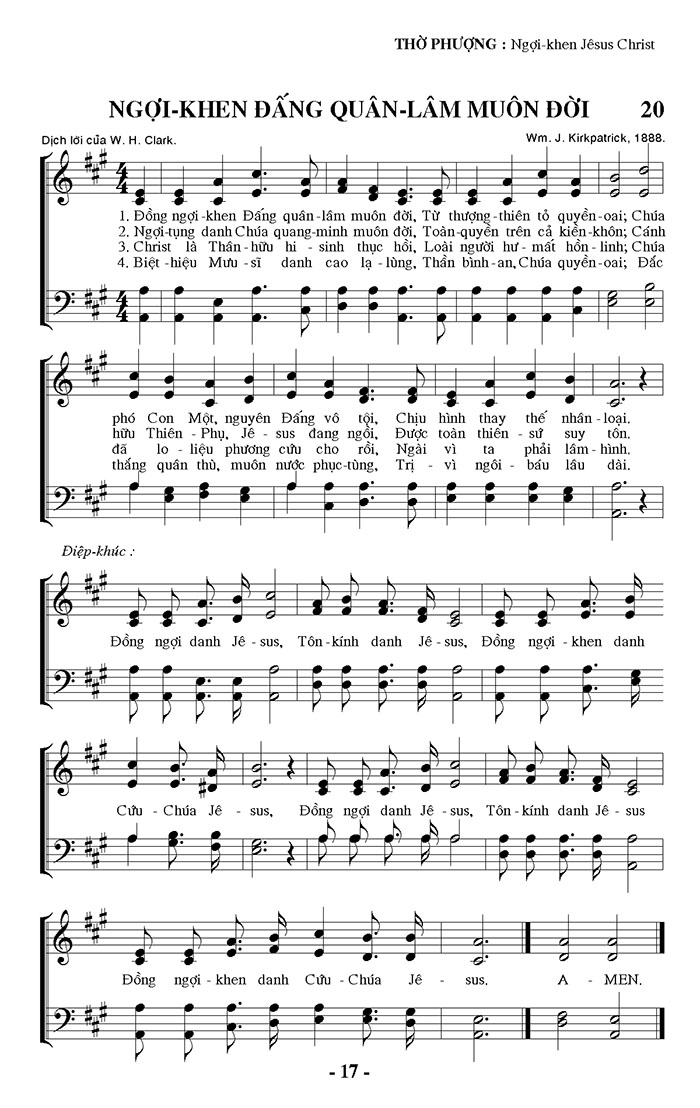 1. Đồng ngợi khen Đấng quân lâm muôn đời, Từ thượng - thiên tỏ quyền-oai; Chúa phó Con Một, nguyên Đấng vô tội, Chịu hình thay thế nhân - loại. 2. Ngợi tụng danh Chúa quang-minh muôn đời, Toàn quyền trên cả kiến khôn; Cánh hữu Thiên - Phụ, Jê sus đang ngồi, Được toàn thiên - sứ suy tôn. 3. Christ là Thân - hữu hi sinh thục hồi, Loài người hư - mất hồn - linh; Chúa đã lo - liệu phương cứu cho rồi, Ngài vì ta phải lâm - hình. 4. Biệt - hiệu Mưu sĩ danh cao lạ lùng, Thần bình an, Chúa quyền-oai; Đắc thắng quân thù, muôn nước phục tùng, Trị - vì ngôi - báu lâu dài. Điệp khúc: Đồng ngợi danh Jê-sus, Tôn - kính danh Jê-sus, Đồng ngợi - khen danh Cứu - Chúa Jê sus, Đồng ngợi danh Jê-sus, Tôn - kính danh Jê sus Đồng ngợi - khen danh Cứu - Chúa Jê sus. A MEN.
