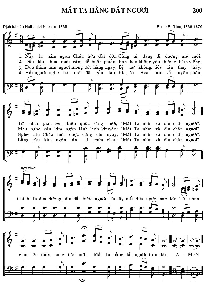 1. Nầy là kim ngôn Chúa hứa đời đời, Cùng ai đang đi đường mê mỏi, Từ nhân gian lên thiên quốc sáng tươi, "Mắt Ta nhìn và dìu chân ngươi". 2. Dầu khi thua mưu cám dỗ buồn phiền, Bạn thân không yêu thương thăm viếng, Mau nghe câu kim ngôn lánh lánh khuyên: "Mắt Ta nhìn và dìu chân ngươi". 3. Đều thâm tâm ngươi mong ước hằng ngày, Bị hư không, tiêu tán thay thảy, Nghe câu Chúa hứa được vững chí ngay, "Mắt Ta nhìn và dìu chân ngươi". 4. Hồi ngươi nghe hơi thở đã gần tàn, Kìa, Vị Hoa tiêu vẫn tuyên phán, Bằng câu kim ngôn ân ái chứa chan: "Mắt Ta nhìn và dìu chân ngươi". Điệp khúc: Chính Ta đưa đường, dìu dắt bước ngươi, Ta lấy mắt đưa ngươi nào lơi; Từ nhân gian lên thiên cung tươi mới, Mắt Ta hằng dắt ngươi trọn đời. A - MEN.