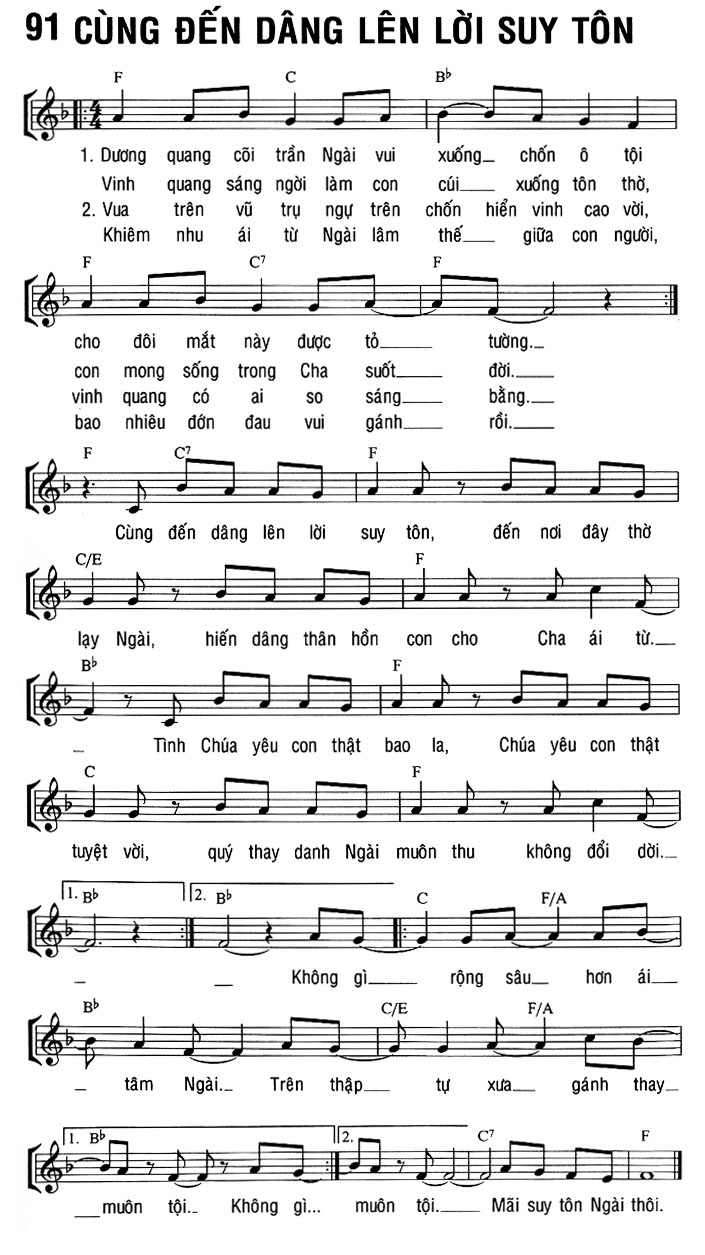 1. Dương quang cõi trần Ngài vui xuống chốn ô tội Vinh quang sáng ngời làm con cúi xuống tôn thờ, cho đôi mắt này được tỏ tường. con mong sống trong Cha suốt đời. Không gì rộng sâu hơn ái tâm Ngài. Trên thập tự xưa gánh thay muôn tội.. Không gì... muôn tội. 2. Vua trên vũ trụ ngự trên chốn hiển vinh cao vời, Khiêm nhu ái từ Ngài lâm thế giữa con người, vinh quang có ai so sáng bằng. bao nhiêu đớn đau vui gánh rồi. Không gì rộng sâu hơn ái tâm Ngài. Trên thập tự xưa gánh thay muôn tội.. Không gì... muôn tội. Điệp khúc: Cùng đến dâng lên lời suy tôn, đến nơi đây thờ lạy Ngài, hiến dâng thân hồn con cho Cha ái từ. Tình Chúa yêu con thật bao la, Chúa yêu con thật tuyệt vời, quý thay danh Ngài muôn thu không đổi dời. Mãi suy tôn Ngài thôi.