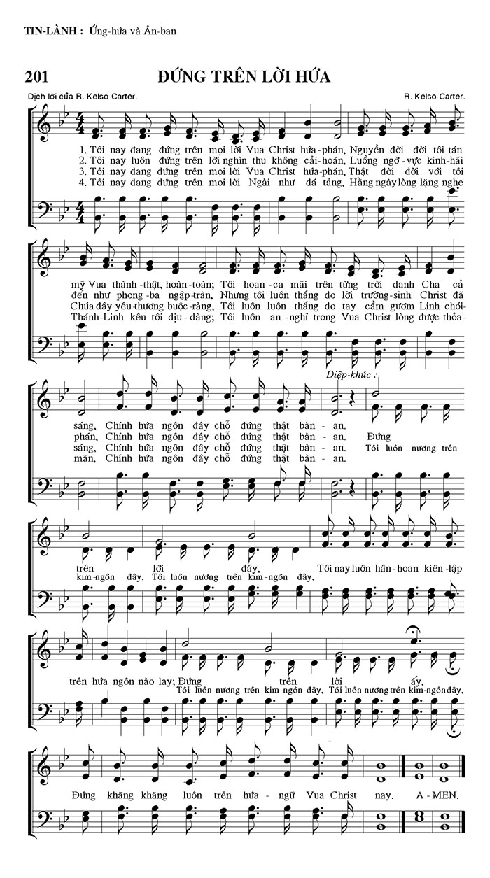 1. Tôi nay đang đứng trên mọi lời Vua Christ hứa-phán, Nguyễn đời đời tôi tán mỹ Vua thành-thật, hoàn-toàn; Tôi hoan-ca mãi trên từng trời danh Cha cả sáng, Chính hứa ngôn đây chỗ đứng thật bàn an. 2. Tôi nay luôn đứng trên lời nghìn thu không cải-hoán, Luồng ngờ vực kinh-hãi đến như phong-ba ngập tràn, Nhưng tôi luôn thắng do lời trường-sinh Christ đã phán, Chính hứa ngôn đây chỗ đứng thật bàn an. 3. Tôi nay đang đứng trên mọi lời Vua Christ hứa phán, Thật đời đời với tôi Chúa đây yêu thương buộc ràng, Tôi luôn luôn thắng do tay cầm gươm Linh chói-sáng, Chính hứa ngôn đây chỗ đứng thật bàn an. 4. Tôi nay đang đứng trên mọi lời Ngài như đá tảng, Hằng ngày lòng lặng nghe Thánh-Linh kêu tôi dịu-dàng; Tôi luôn an-nghỉ trong Vua Christ lòng được thỏa-mãn, Chính hứa ngôn đây chỗ đứng thật bàn an. Điệp khúc: Đứng trên lời đây, Tôi nay luôn hân-hoan kiên-lập kim-ngôn đây, Tôi luôn nương trên kim-ngôn đây, Đứng trên hứa ngôn nào lay; Đứng trên lời ấy, Tôi luôn nương trên kim ngôn đây, Tôi luôn nương trên kim-ngôn đây, Đứng khăng khăng luôn trên hứa-ngữ Vua Christ nay. A-MEN.