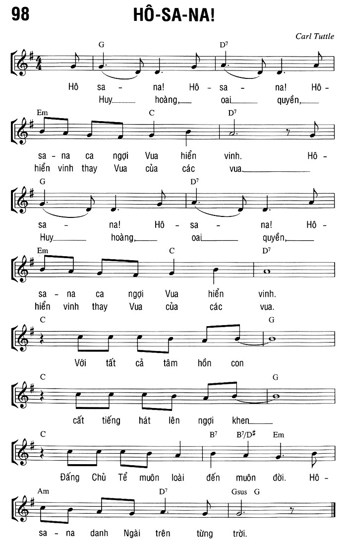 1. Hô-sa-na! Hô-sa-na! Hô-sa-na ca ngợi Vua hiển vinh. Hô-sa-na! Hô-sa-na! Hô-sa-na ca ngợi Vua hiển vinh. 2. Huy hoàng, oai quyền, hiển vinh thay Vua của các vua. Huy hoàng, oai quyền, hiển vinh thay Vua của các vua. Điệp khúc: Với tất cả tâm hồn con cất tiếng hát lên ngợi khen Đấng Chủ Tể muôn loài đến muôn đời. Hô-sa-na danh Ngài trên từng trời.