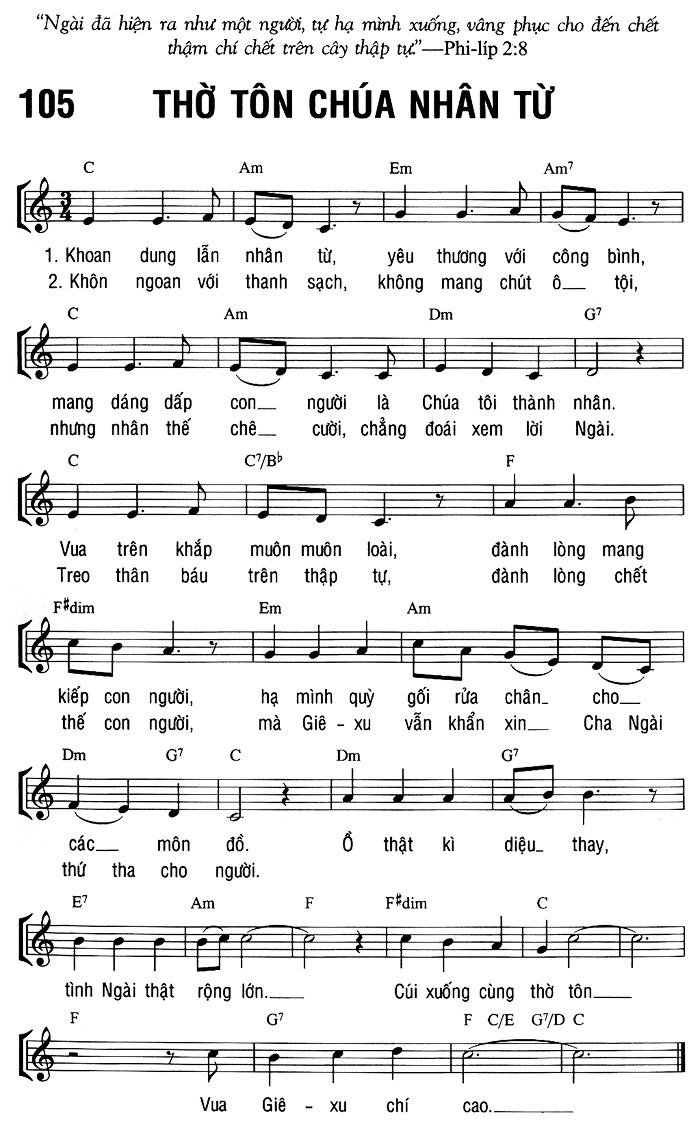 1. Khoan dung lẫn nhân từ, yêu thương với công bình, mang dáng dấp con người là Chúa tôi thành nhân. Vua trên khắp muôn muôn loài, đành lòng mang kiếp con người, hạ mình quỳ gối rửa chân cho các môn đồ. Ô thật kì diệu thay, tình Ngài thật rộng lớn. 2. Khôn ngoan với thanh sạch, không mang chút ô tội, nhưng nhân thế chê cười, chẳng đoái xem lời Ngài. Treo thân báu trên thập tự, đành lòng chết thế con người, mà Giê-xu vẫn khẩn xin Cha Ngài thứ tha cho người. Ô thật kì diệu thay, tình Ngài thật rộng lớn. Điệp khúc: Cúi xuống cùng thờ tôn Vua Giê-xu chí cao.